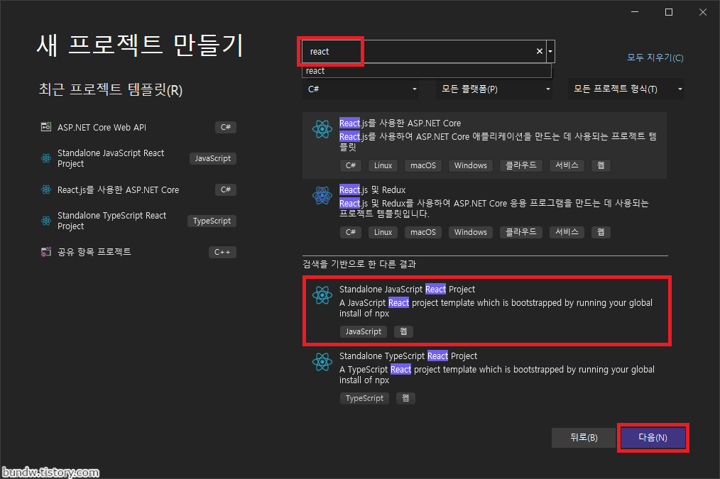 VisualStudio를 실힝하고, 새 프로젝트 만들기를 클릭합니다. 이어서 상단 검색창에 react를 입력 후 검색으로 나온 결과 중, Standalone Javascript React Project 항목을 클릭하고 다음 버튼을 클릭합니다.