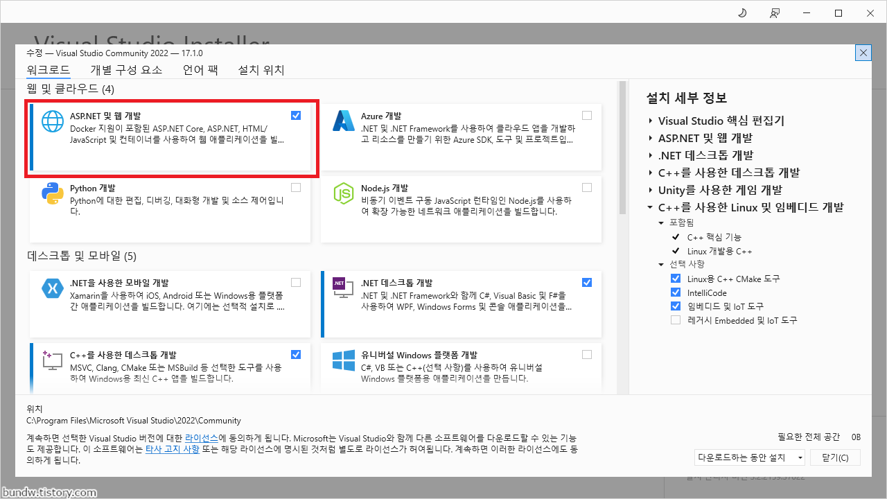 먼저 VisualStudio 워크로드에 ASP.NET 및 웹 개발 워크로드가 추가 되어있는지 확인하고, 없다면 추가 및 설치해줍니다.