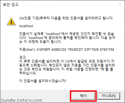 최초 실행시 SSL 인증서 확인 창이 뜨는데, 이 메세지를 다시 표시 안 함 및 예 버튼을 클릭하여 진행합니다.