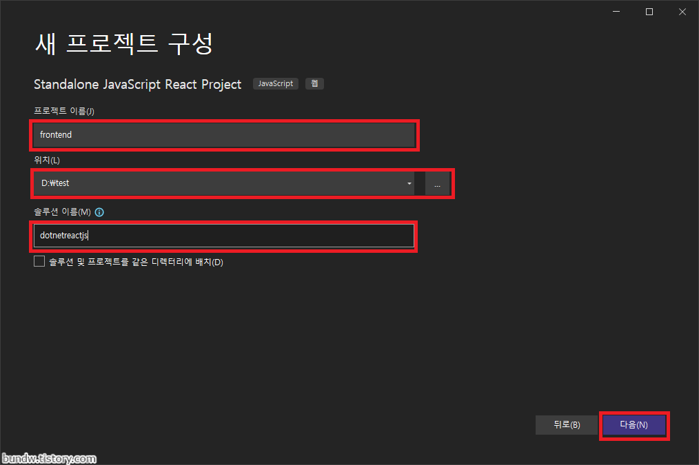 프로젝트 이름, 위치, 솔루션 이름을 적절히 지정하고 다음 버튼을 클릭합니다.