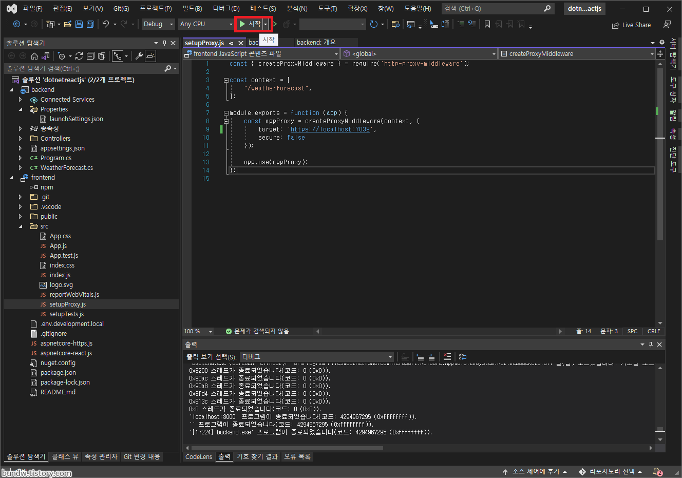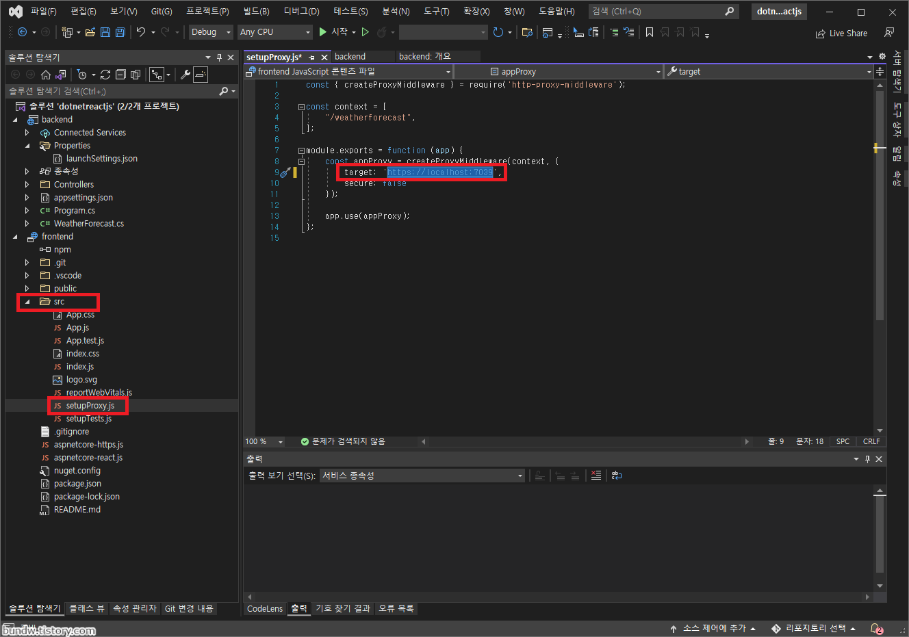 솔루션 탐색기에서 React 프로젝트 목록의 src > setupProxy.js 항목을 클릭하고, 내용에서 target값을 이전에 복사한 값으로 변경하고 저장합니다. (예. https://localhost:7039)