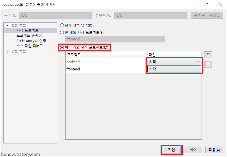 솔루션 속성 페이지 첫 화면에서, 여러 개의 시작 프로젝트를 선택하고, 각 프로젝트의 작업을 시작으로 변경합니다. 그리고 확인 버튼을 클릭합니다.