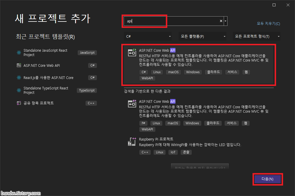 새 프로젝트 추가 창이 열리면, 상단 검색에 api를 입력 후 검색으로 나온 결과 중, ASP.NET Core Web API 항목을 클릭하고 다음 버튼을 클릭합니다.