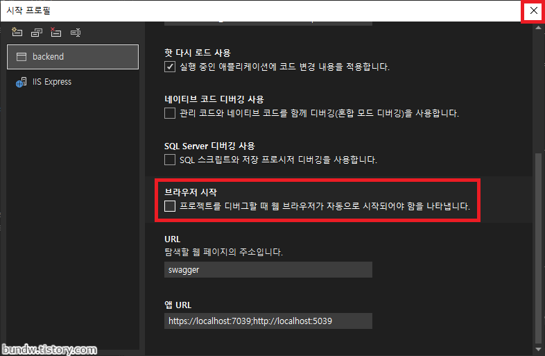 다시 솔루션 탐색기에서 ASP.NET 프로젝트 목록의 Properties > launchSettings.json 항목을 클릭하고, 내용에서 applicationUrl값의 https로 시작하는 주소 및 포트 값을 클립보드나 메모장에 복사합니다. (예. https://localhost:7039)