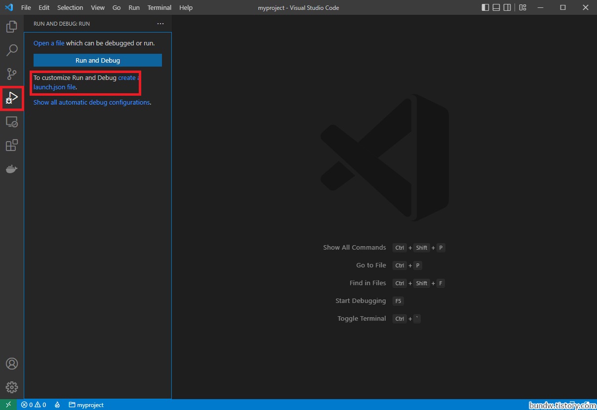 좌측의 Run and Debug 아이콘을 클릭하고(또는 Ctrl+Shfit+D키), 좌측 메뉴의 create launch.json file의 파란 글씨의 링크를 클릭합니다.