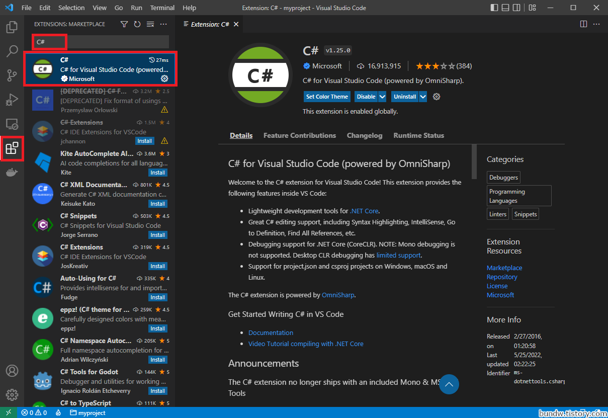 VSCode Extention에 C#이 추가되어있지 않다면, C#키워드로 검색해서 설치합니다.