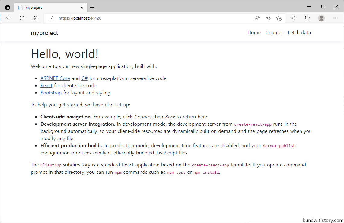 "ASP.NET Core with React.js" 템플릿이 성공적으로 생성되었습니다.