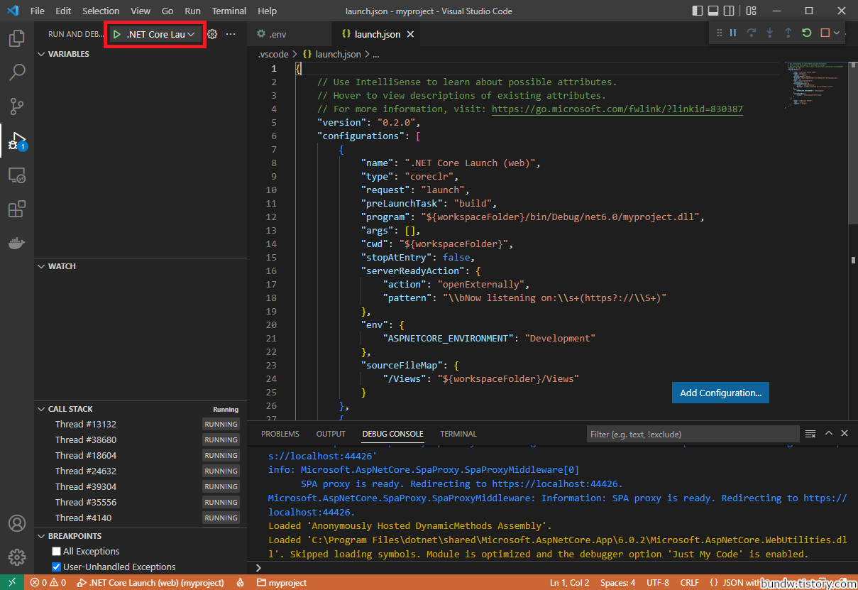 launch.json 파일이 생성되면, 좌측 메뉴의 Debug를 클릭(또는 F5키)하여 실행합니다.