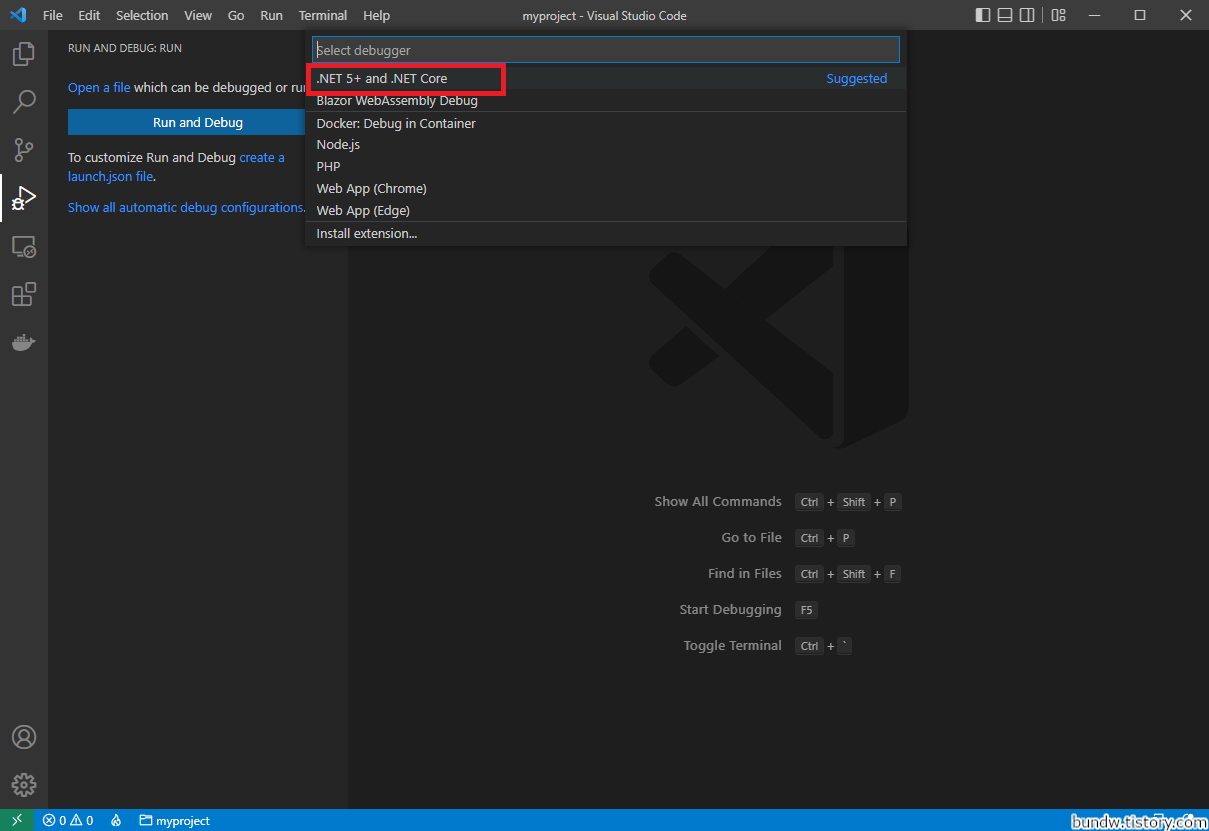 Select debugger에 .NET 5+ and .NET Core을 클릭합니다.