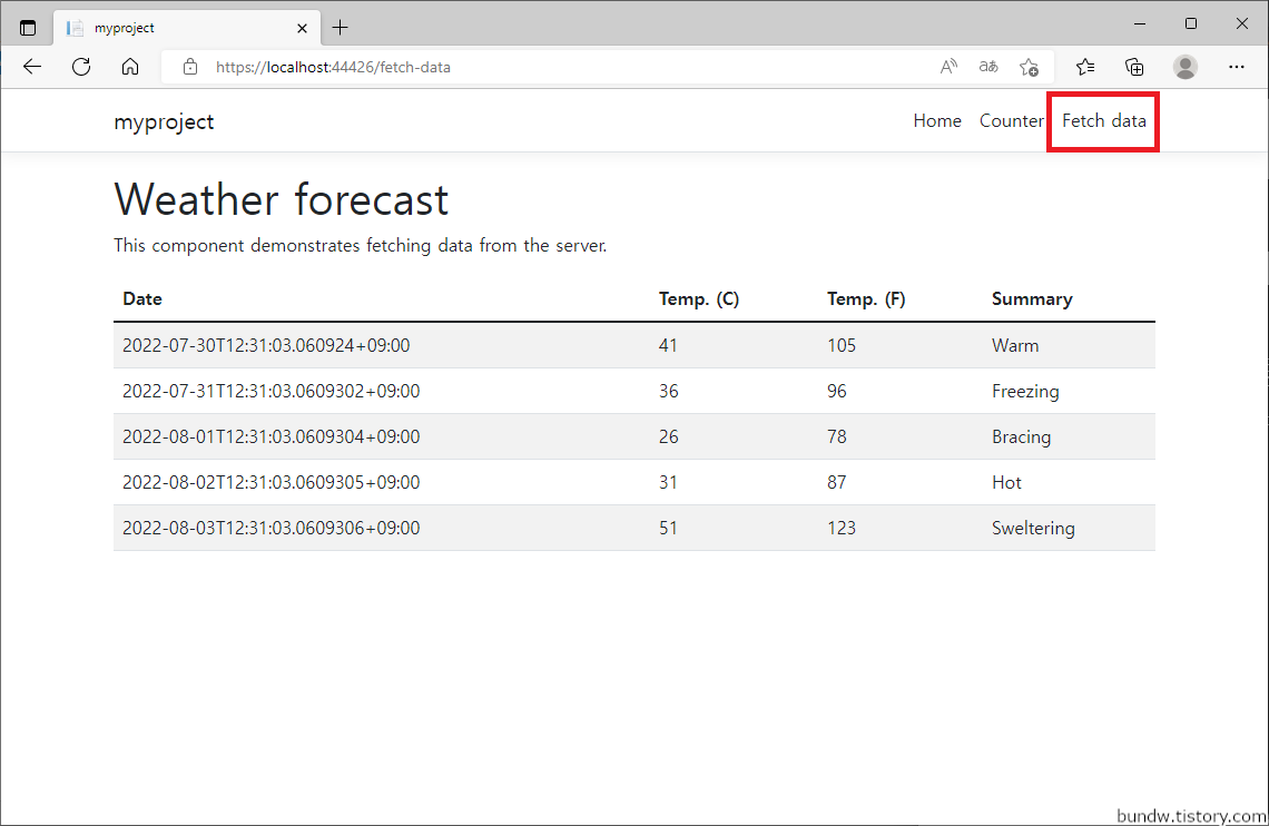 브라우저 상단의 Fetch data 메뉴를 클릭하여 ASP.NET와 React가 서로 연동이 잘 되는지 확인합니다.