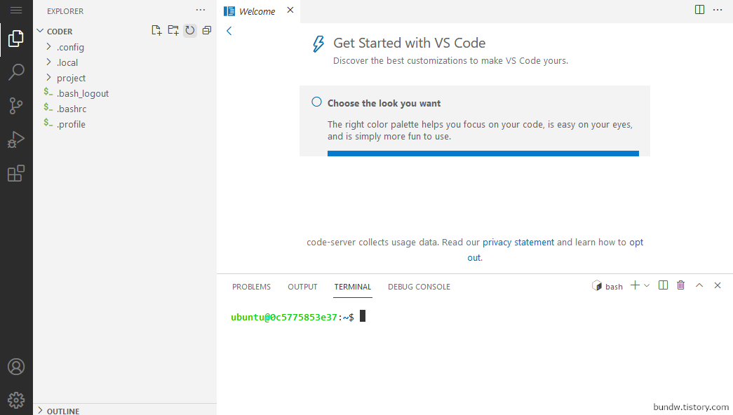웹VSCode에서 터미널을 열게 되면 컨테이너 내부의 쉘을 실행하게 됩니다.