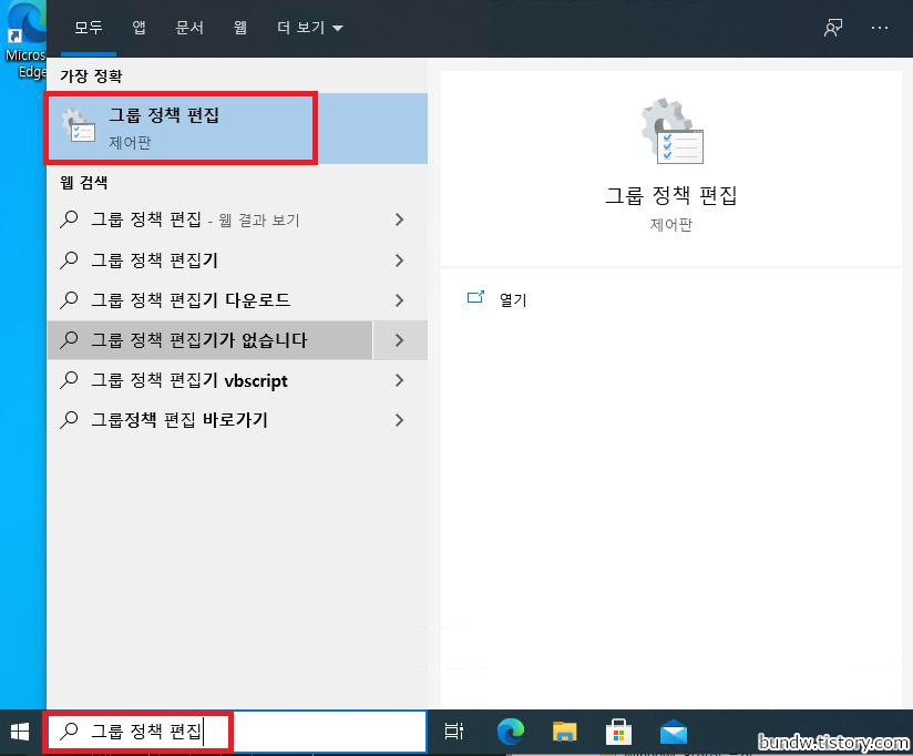 시작버튼을 클릭하고 그룹 정책 편집을 검색하여 실행합니다.