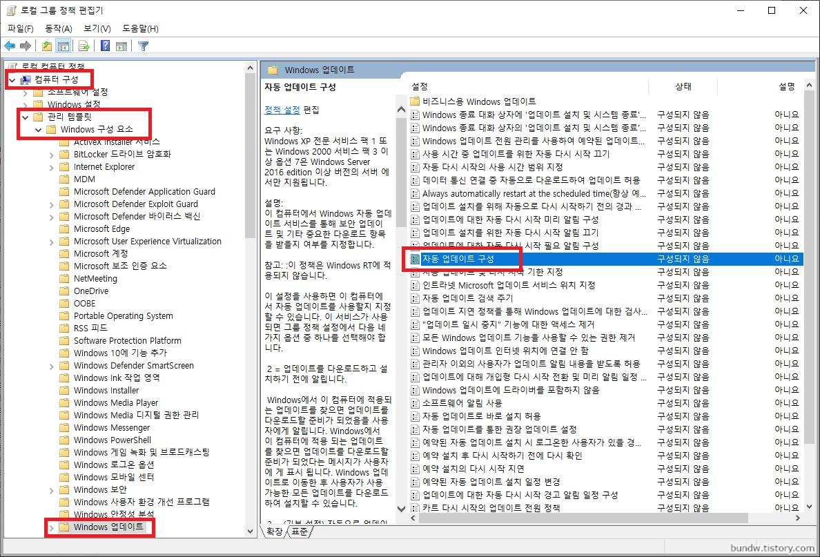 좌측 화면에서 컴퓨터 구성 > 관리 템플릿 > Windows 구성 요소 > Windows 업데이트를 순서대로 클릭하고 우측의 자동 업데이트 구성 항목을 확인합니다.