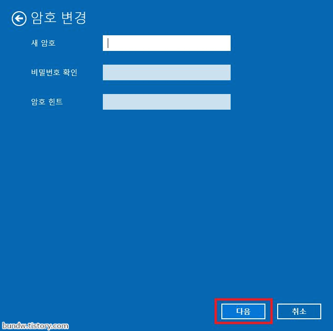 새 암호 입력창이 뜨면 아무것도 입력하지 않고 다음 버튼을 클릭합니다.