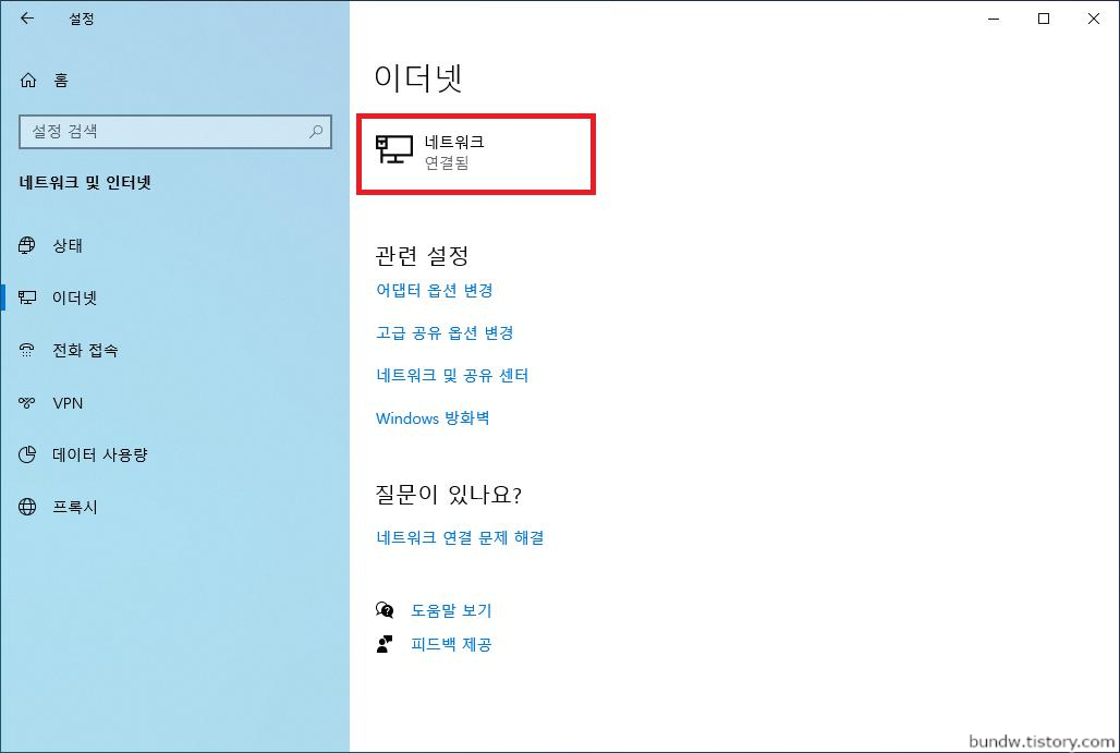 우측에 연결된 네트워크 항목을 클릭합니다.