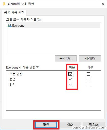 Everyone의 허용 부분을 모두 체크해주고 확인버튼을 클릭합니다.