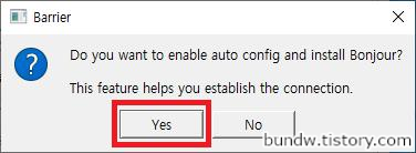 Bonjour 설치 안내에서 맥의 Bonjour가 필요하다면 Yes를 클릭해서 설치합니다. (No를 해도 무관)