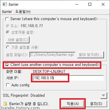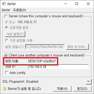 Client를 체크하고 서버 IP에 IP주소를 입력 후 적용버튼을 클릭하면 연결이 시작됩니다.