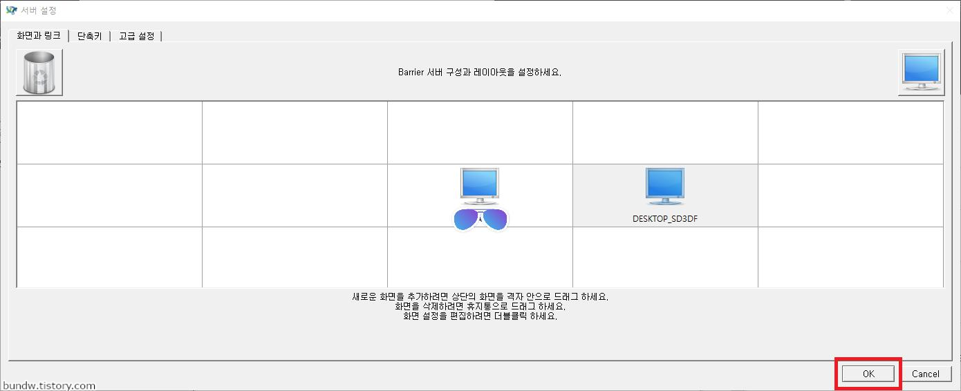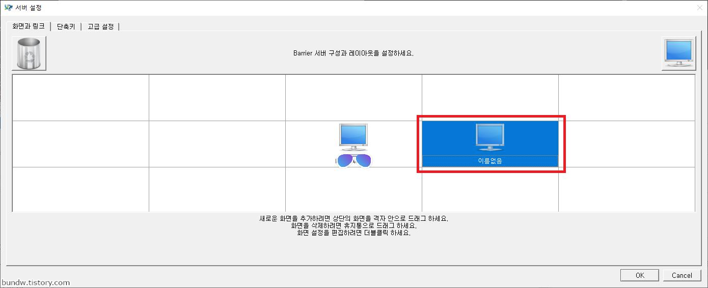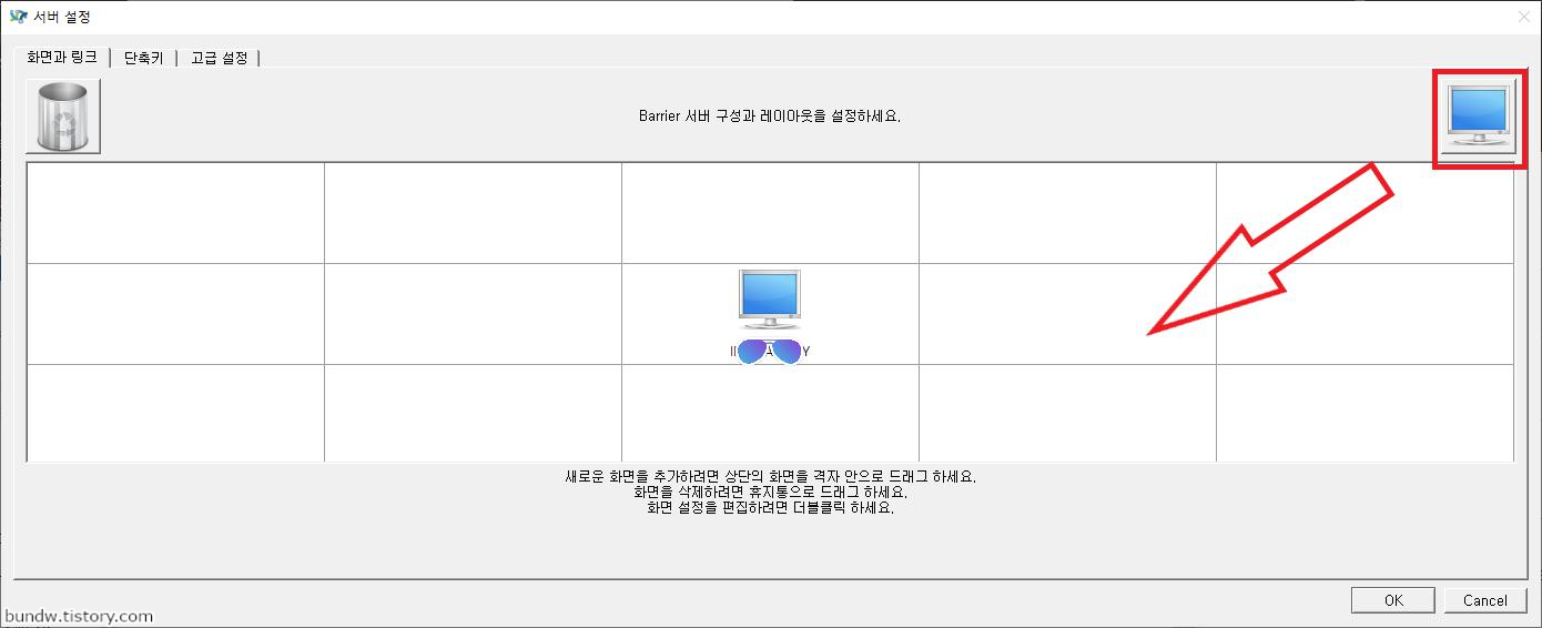 중앙이 현재 서버의 화면 위치이며, 클라이언트의 원하는 위치로 우측 상단의 모니터 버튼을 드래그로 끌어다 놓습니다.