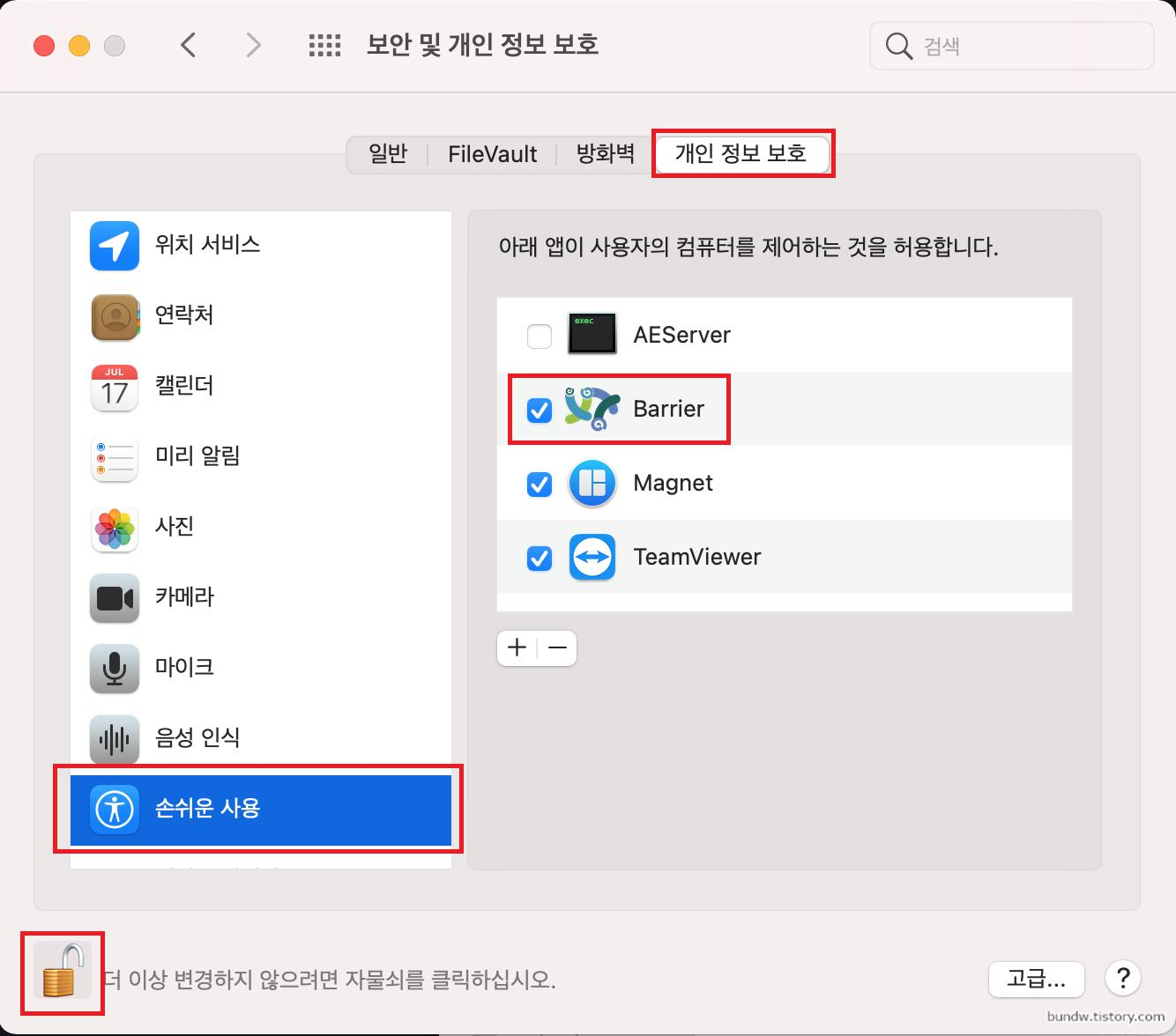 상단 개인 정보 보호탭 클릭, 좌측의 손쉬운 사용을 선택하고 하단의 자물쇠를 클릭해서 변경을 활성화 합니다.