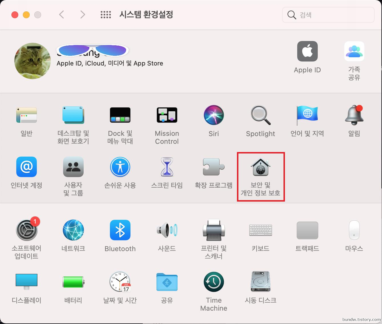 시스템 환경설정에서 보안 및 개인 정보 보호를 클릭합니다.