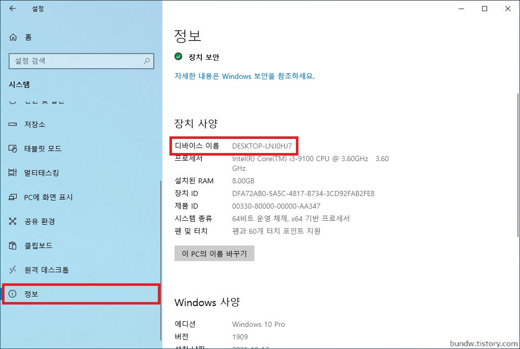좌측 메뉴에서 하단으로 스크롤해서 정보를 클릭하고, 우측에서 디바이스 이름(컴퓨터 이름)을 확인 할 수 있습니다.