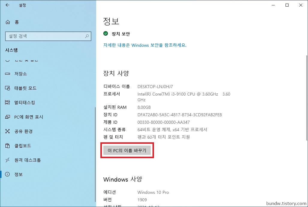 이 PC의 이름 바꾸기 버튼을 클릭합니다.