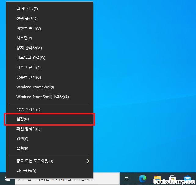 시작 버튼에서 마우스 오른쪽 버튼을 클릭하고 설정을 클릭합니다.