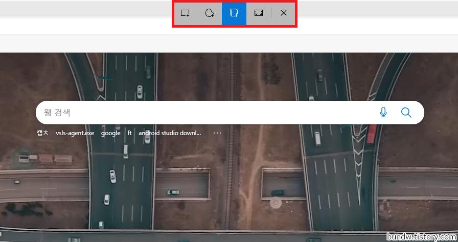 캡처모드가 활성화되면, 화면 상단에 캡처 방식을 선택할 수 있습니다. 왼쪽부터 사각형 선택 영역, 자유형 선택 영역, 창 선택, 전체화면, 취소 입니다.