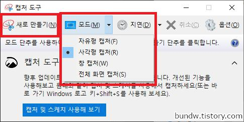 프로그램이 실행되면 모드를 클릭해서 원하는 모드를 선택하고, 새로 만들기 버튼을 클릭해서 캡처를 합니다.